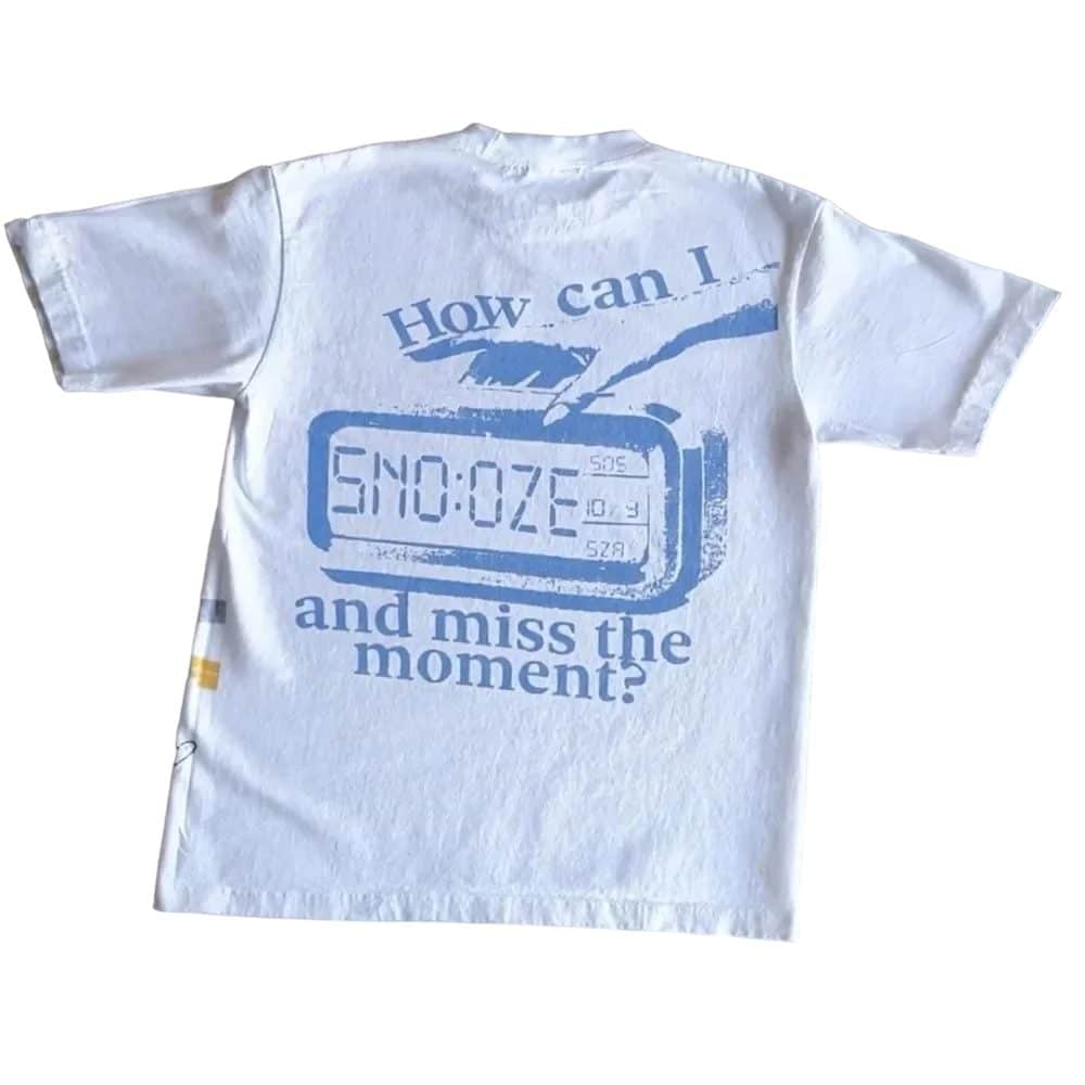 Celebrate SZA's iconic SOS album with the Snooze T-Shirt. This tee features a design that replicates the album cover, capturing SZA sitting off a yacht. Perfect for fans of the artist and her groundbreaking album, this shirt combines style and tribute in one must-have piece. Shop now to add this standout tee to your collection and show your love for SZA.